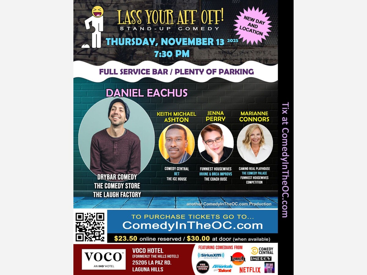Joining Daniel at the Voco Hotel is crowd favorite Keith Michael Ashton. Keith’s mesmerizing stage presence and honest, razor-sharp humor has made him a favorite at comedy clubs across the U.S. Keith performs regularly at Los Angeles clubs such as the Improv and Ice House and has made television appearances on shows on CBS, BET, and Comedy Central.